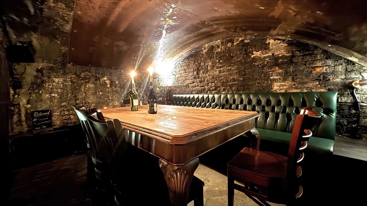 You will find this one large table inside our vaulted cave, behind the cellar bars. It can sit up to 12 people and can only be reserved online through the link provided below.